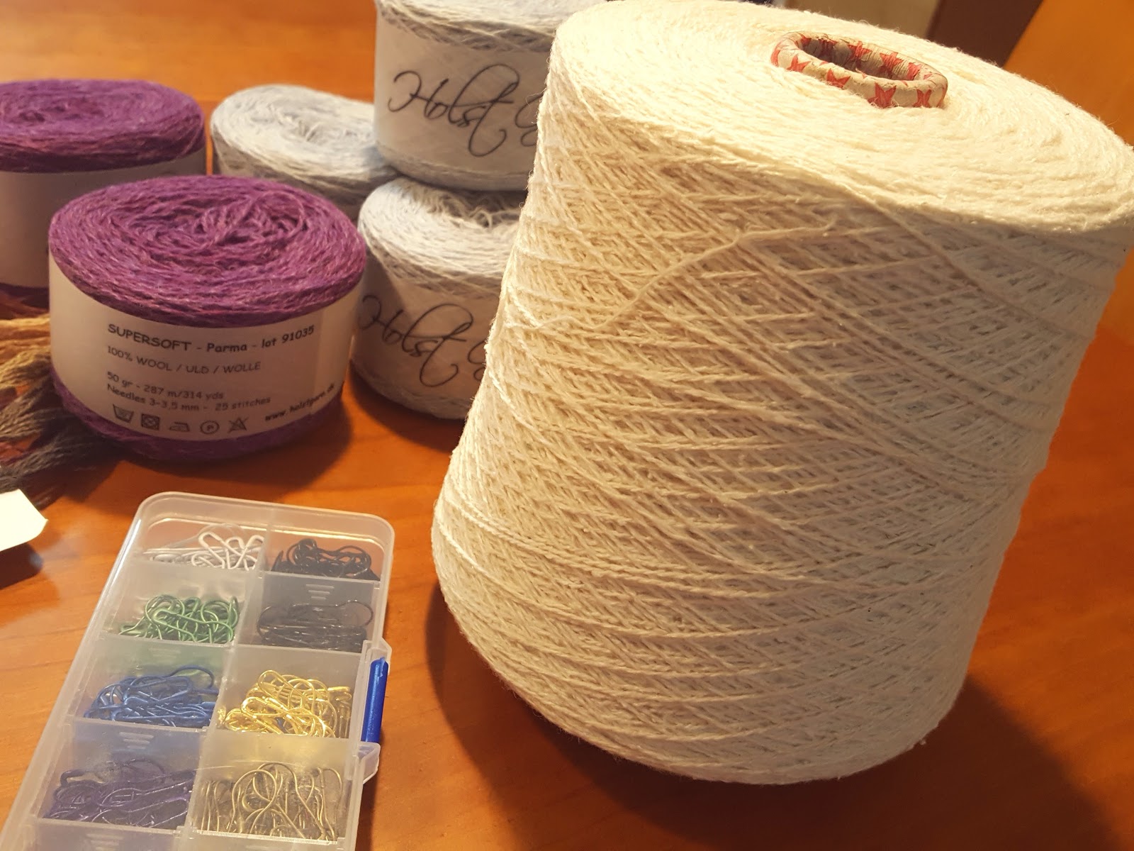 supersoftを2本取りで編むつもりで色を迷ってIced/Parmaと手持ちのEcruの3色で、編み込初挑戦です